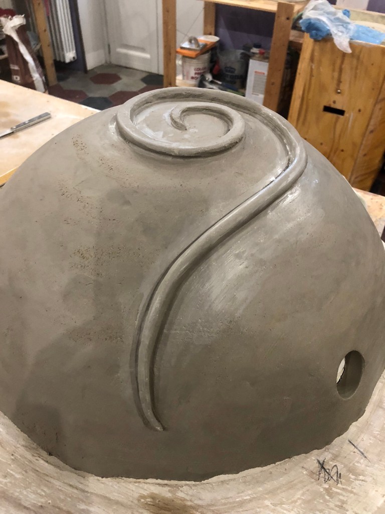 It was a big pot, formed of clay moulded over a bowl, intended as a home for a large Philodendron to be hung from the ceiling of my house. But work, travel and more latterly COVID-19 got in the way. The pot was fired and sat in my friend Carlotta’s workshop, waiting for an opportunity to return my attention to it.