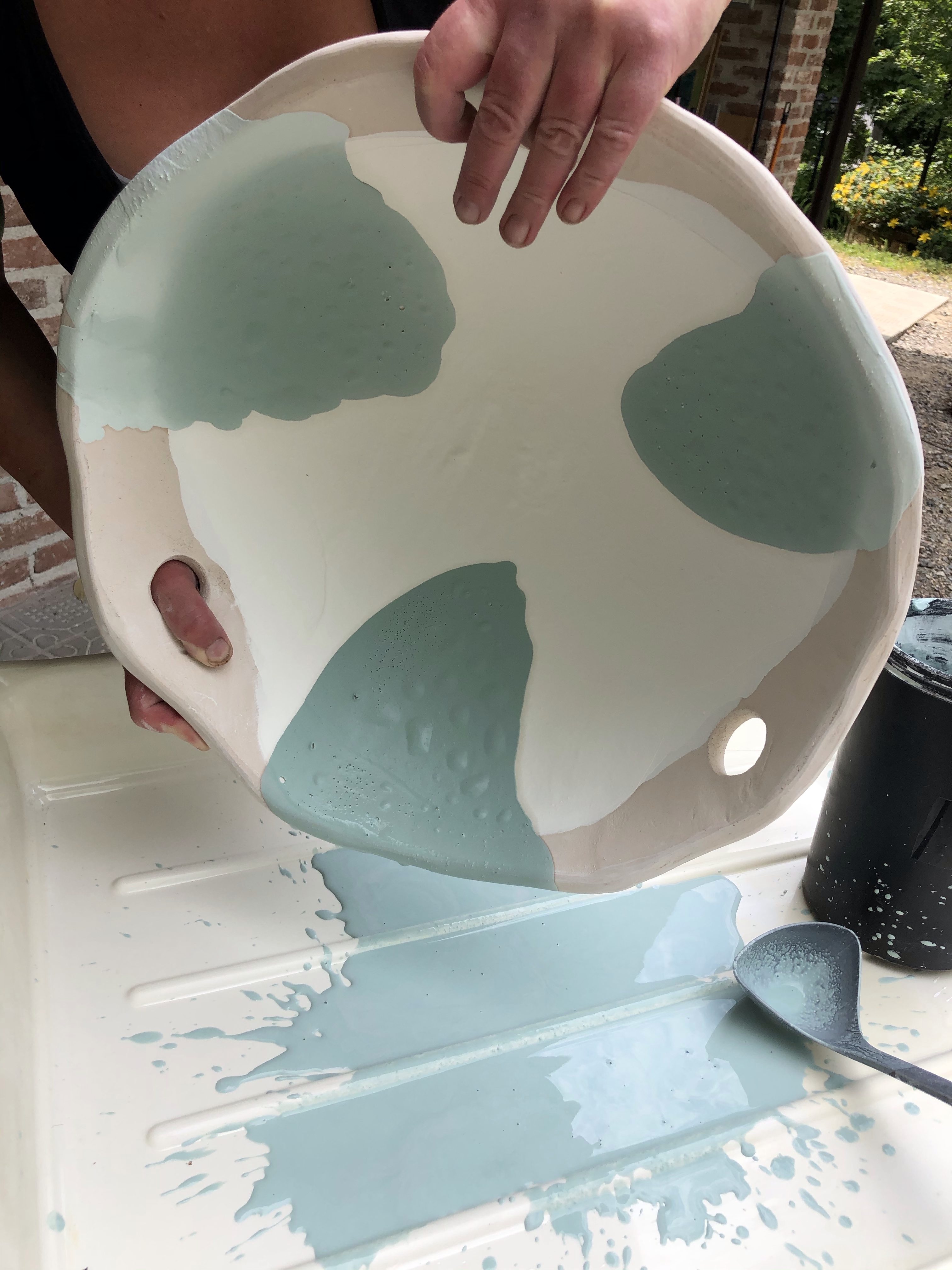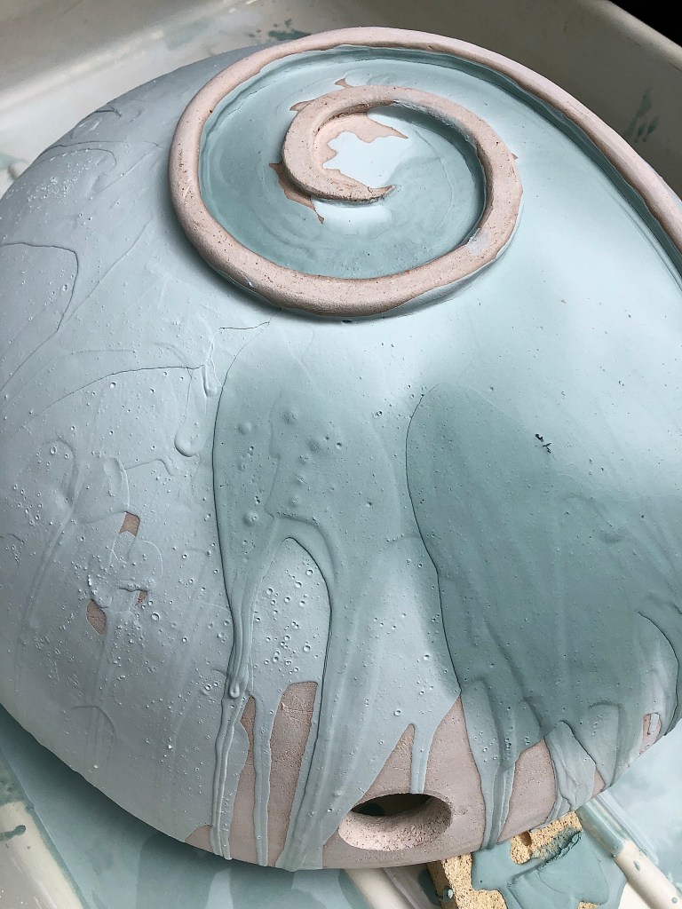 Once the colours were chosen – a mixture of blues and greens – the glaze was applied to the pot. Carlotta explained that overlapping areas of glaze would react with one another in ways that could not be planned for or predicted. There was no point in trying to overly control the process because the outcome was, ultimately, beyond my control…